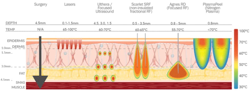 The above Energy Depth and Temperature chart shows how various treatment modalities affects the skin at different levels. Controlled thermal damage at various skin depths causes a reaction in the tissue, which in turn stimulates the body’s natural healing response. Depending on your skin type and needs, we can recommend a specific treatment such as Scarlet RF with microneedling or a customized plan using multiple therapies, including focused ultrasound and fractional resurfacing using lasers, which focus energy at different depths for skin tightening and surface conditions like hyperpigmentation, age spots and scars from acne or surgery.